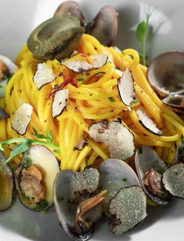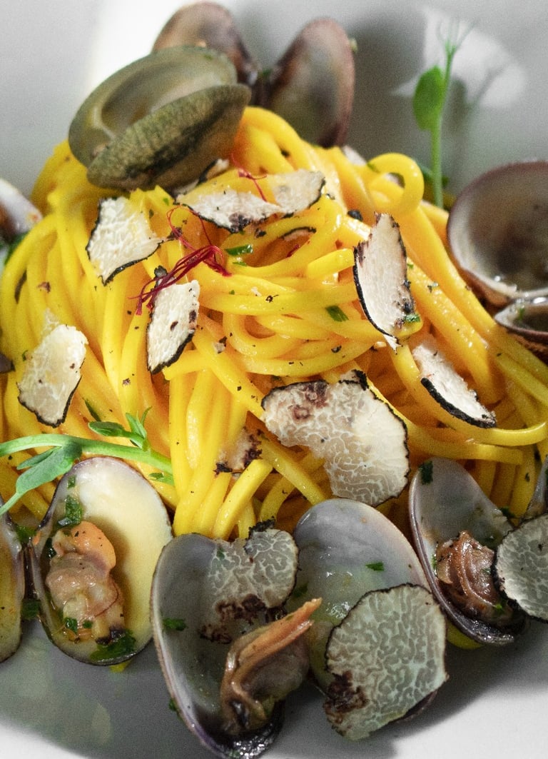 Il cuore del menù è affidato agli spaghetti alla chitarra del Pastificio Artigiano Molese, conditi con zafferano del Salento, vongole veraci e tartufo nero pregiato.