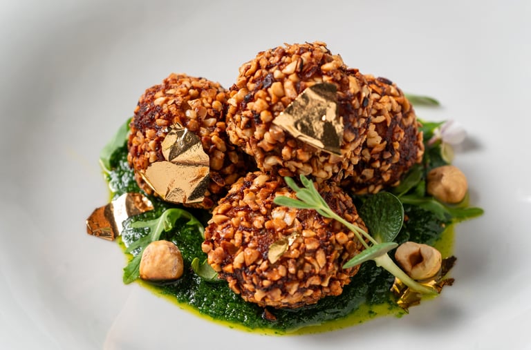Il tonno rosso in pasta kataifi su coulis di peperoni arrosto aggiunge struttura e contrasto, mentre il rocher di ricotta e gambero, cotto in salsa ponzu, ricoperto di nocciola e servito su pesto di rucola, porta equilibrio tra morbidezza, acidità e croccantezza.