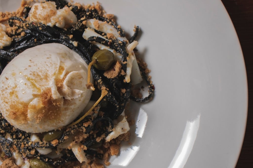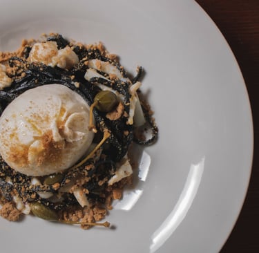 Il Tagliolino Artigianale: Creato con la semola di Altamura da Mamma Tonia. Una texture ruvida, pensata per catturare l'essenza del nero di seppia e non lasciarla scivolare via.